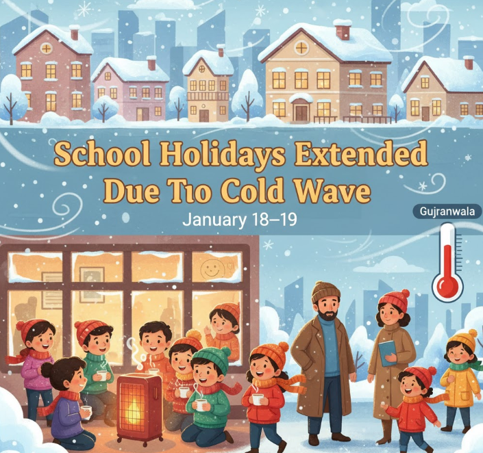 A severe cold wave has prompted the Punjab education department to extend school holidays by one week as a precautionary measure. All schools and educational institutions across Punjab will now remain closed until January 18, with reopening scheduled for January 19. This decision aims to protect students and staff from the ongoing harsh winter conditions, including dropping temperatures, dense fog, and biting winds that increase health risks. The Minister of Education stressed that the extension prioritizes children’s safety and encourages parents to keep their children warm and avoid unnecessary outdoor exposure during this period. Residents are advised to stay updated with weather forecasts and follow safety guidelines as the cold wave persists. Gujranwala.blog will continue to deliver timely local news and weather updates, keeping the community informed about ongoing developments and their impact on daily life. givew me a promt to create a photo attractive and animated for gujranwala.blog